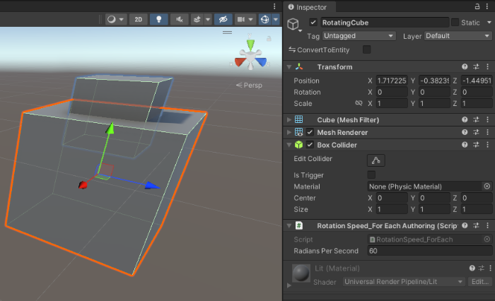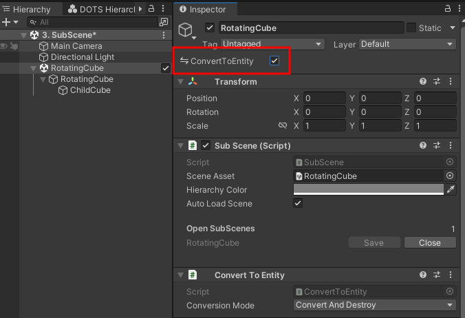 그럼, Hierarchy 뷰에 RotationCube 씬이 생성되고 해당 씬 안에 위에서 선택한 RotatingCube가 들어가 있다. RotatingCube에 ConvertToEntity를 활성화하면 씬 안의 GameObject도 자동으로 ConvertToEntity가 된다.