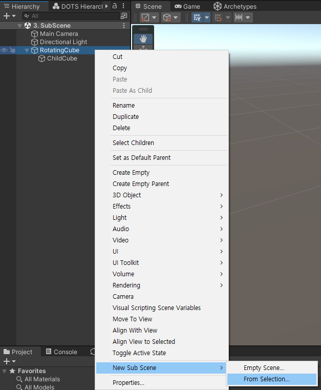 RotatingCube을 우클릭 > New Sub Scene > From Selection... 을 클릭하고 3. SubScene 폴더에 저장한다.