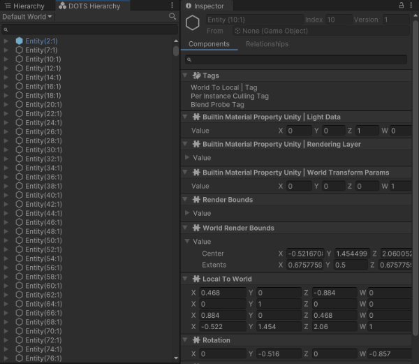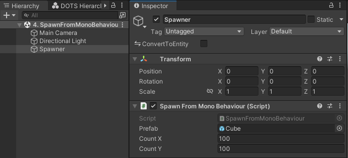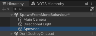 Spawner 게임오브젝트는 Entity로 변환시키지 않았기 때문에 DOTS Hierarchy뷰가 아닌 Hierarchy뷰에 존재한다.