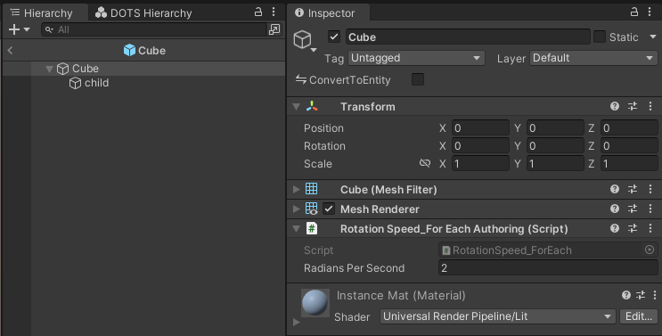 Cube를 두개 만들고 부모 자식 관계로 만든다. #1 ForEach에서 만든 RotationSpeed_ForEach를 Component로 추가한다.