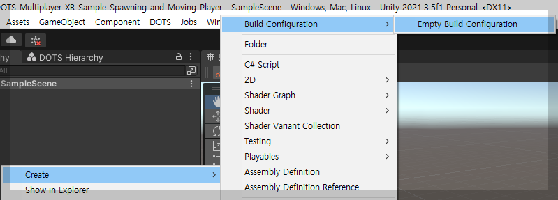 Project - Assets 폴더에 우클릭 > Create > Build Configuration > Empty Build Configuarion 을 클릭한다. 생성된 파일의 이름을 Window로 변경한다.