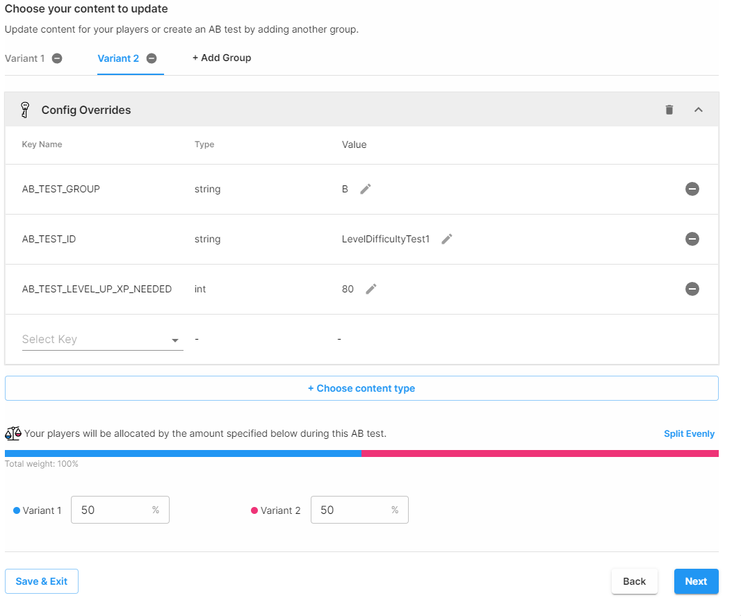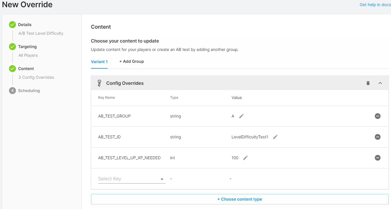 Variant AB_TEST_GROUP AB_TEST_LEVEL_UP_XP_NEEDED AB_TEST_ID Variant 1 A 100 LevelDifficultyTest1 Variant 2 B 80 Variant 3 C 60 Variant 4 D 40 Variant 5 E 20 3-4. Scheduling