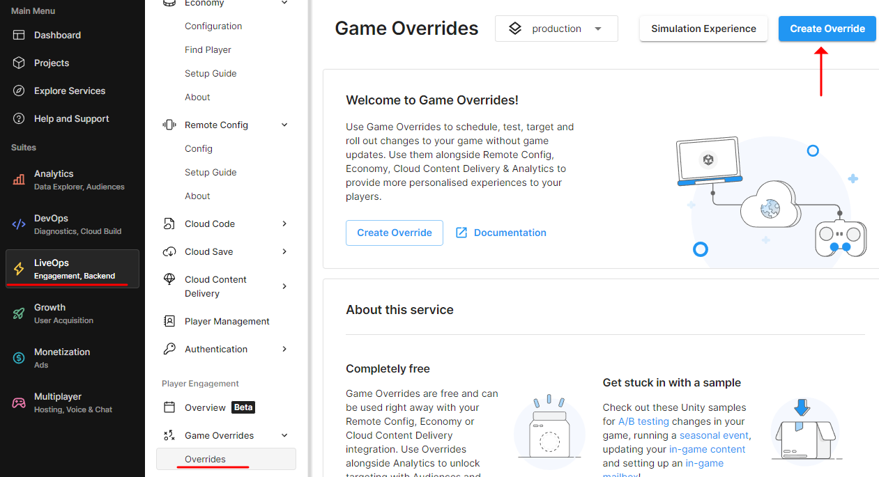 대쉬보드에서 LiveOps > Game Overrides > Overrides 로 이동한 후 Create Override 버튼을 클릭한다.