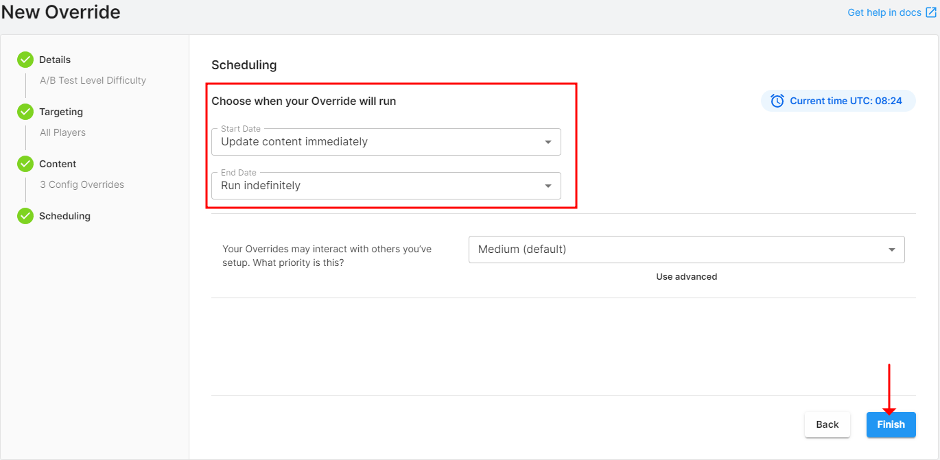 새롭게 만드는 Override가 어느 기간 동안 활성화될지 설정하는 항목이다. 생성된 즉시 실행되게 만들고 End는 없이 무기한 실행되도록 스케쥴을 설정한다. Finish 버튼을 클릭하면 Override가 생성된다.