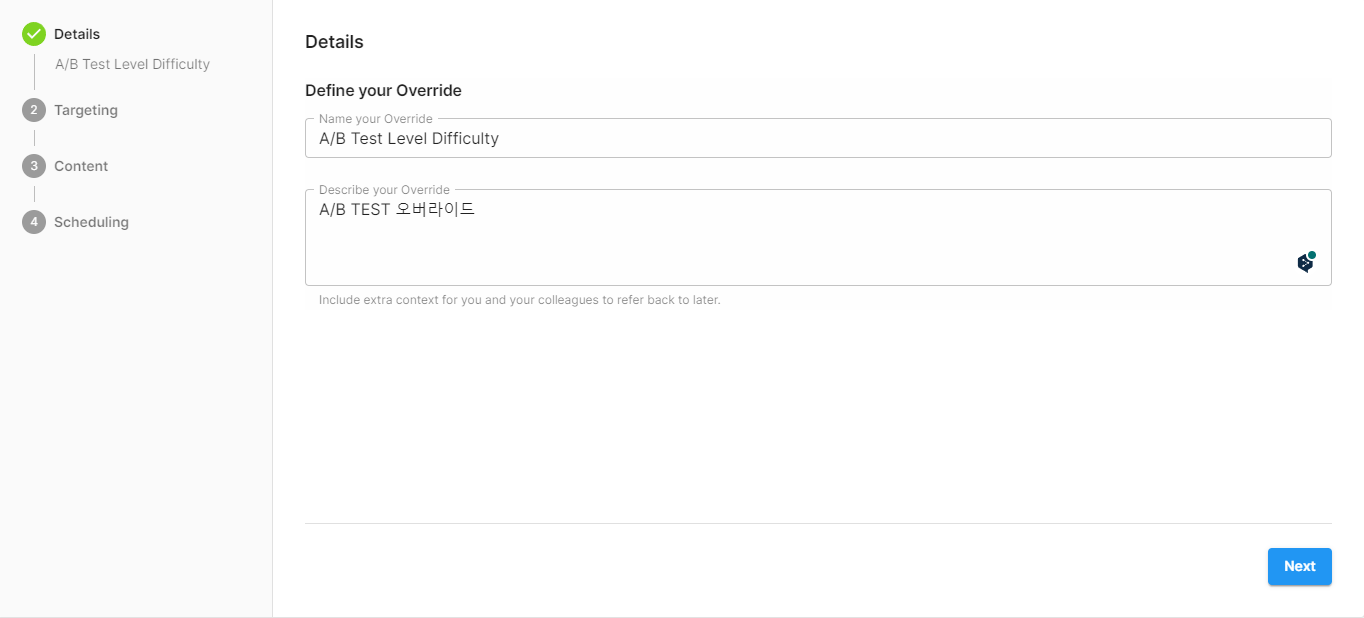 오버라이드 이름과 설명을 입력한 후 Next 클릭