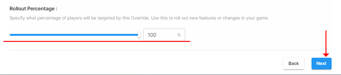 Targetting 에서 맨 아래로 내려가면 Rollout Percentage 라는 항목이 있습니다. 100%로 입력한 후 Next 버튼 클릭한다.