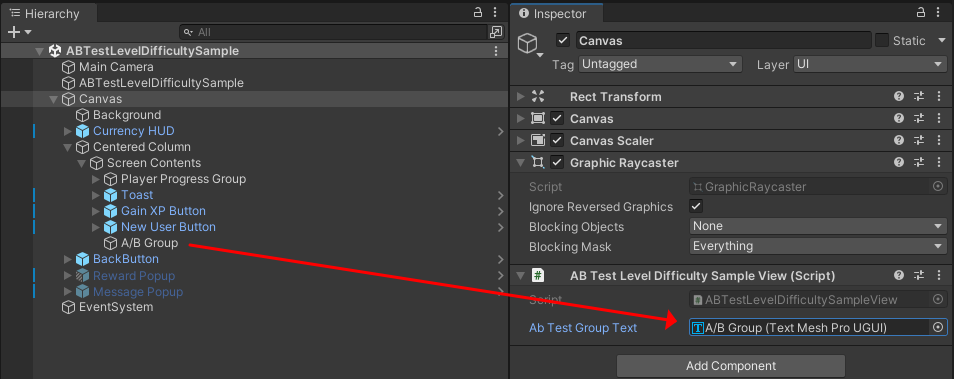 Canvas에 ABTestLevelDifficultySampleView 를 추가하고 A/B Test Group Text 변수에 A/B Group 게임오브젝트를 넣어줍니다.