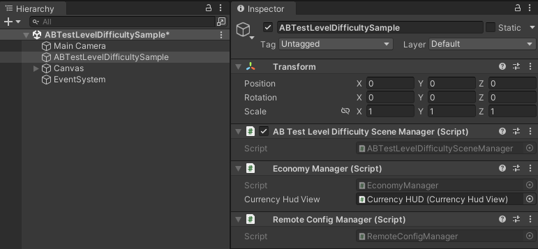 ABTestLevelDifficultySample 오브젝트에 RemoteConfigManager.cs를 추가합니다.