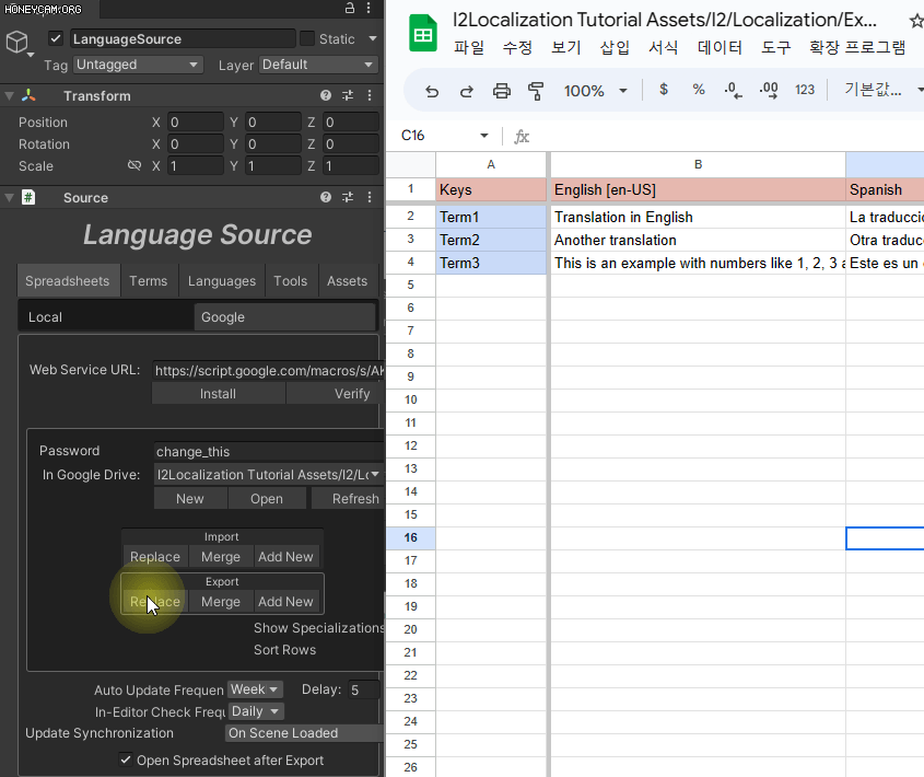 번역 작업이 완료되면 유니티 에디터에서 버튼 하나로 자연스럽게 번역이 다운로드 또는 업로드됩니다.